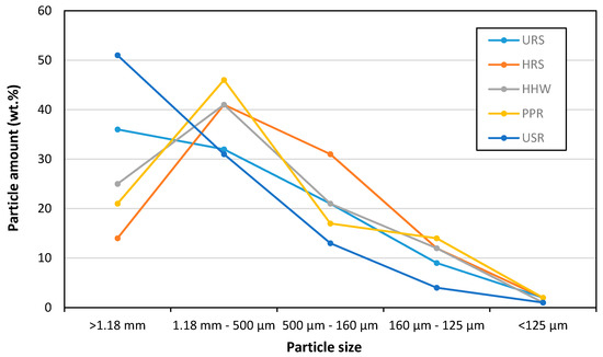 The most significant factors affecting overall pellet quality are particle size and moisture content. According to MacBain, finer particle sizes shows conformity with greater pellet strength and durability, as large particles serve as fissure points [40]. Generally, the quality of the pellets is inversely proportional to particle size. Several studies have reported that smaller particle sizes will produce higher-density pellets [41]. However, according to Payne, a proportion of fine-to-medium particles is required for achieving good pellet quality, but the pellet quality and efficiency of commercial pellets will suffer if coarse material is missing [42]. Payne further reported that to produce high-quality pellets the particle size distribution should be <0.25 mm (≥20 wt%), 0.25–2.00 mm (≈75 wt%), and >2 mm (≤5 wt%) [43]. In conclusion, the best pellet quality could be attained with a mixture of different particle sizes because such a combination increases inter-particle bonding and eliminates inter-particle spaces [41,42,43,44]. In this work, the authors used raw materials with heterogeneously distributed particles and particle size (less than 3 mm). Figure 3 depicts the particle size distributions of five kinds of raw material used in this research. Figure 3 also illustrates that hydrothermally treated rice straw, hydrothermally treated clean hospital solid waste, and pyrolytic waste plastic residue exhibited more homogeneously distributed and finer-sized particles than did untreated rice straw and Sakhalin fir residue. The major particle fractions in the untreated rice straw and Sakhalin fir residue were larger than 1.18 mm, whereas those in the hydrothermally treated rice straw, hospital solid waste, and pyrolytic plastic waste residue were less than 1.18 mm. These findings indicate that hydrothermally treated products have higher amounts of fine particles from which high-quality fine-particle fuel pellets can be produced. The major reason behind this phenomenon is the mechanical action of the blades. A minor reason could also be the effect of hydrothermal treatment, as subcritical water shows properties such as low viscosity and high organic solubility during hydrothermal treatment, and due to this, the physical structure of the particles break down into smaller and simpler molecules [32].