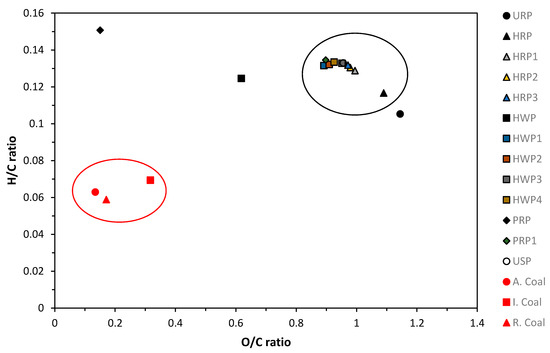 Figure 4 shows a comparison of elemental ratios between fuel pellets and coal. To measure fuel pellet quality, we compared the elemental ratios and physicochemical characteristics of fuel pellets with Australian coal (A. Coal) [52], Indonesian coal (I. Coal) [53], and Russian coal (R. Coal) [54]. Figure 4 depicts that pellets made of hydrothermally treated hospital solid waste, hydrothermally treated rice straw, and pyrolytic plastic waste residue had higher O/C ratios and H/C ratios compared to coal. For coal, the O/C ratio ranged between 0.15–0.35, and the H/C ratio ranged between 0.055–0.070, whereas for fuel pellets it ranged between 0.80–1.20 and 0.10–0.14, respectively. The pellets made of hydrothermally treated hospital solid waste and hydrothermally treated rice straw (or a mixture of the two) showed very high H/C ratios, illustrating that hydrothermal treatment improved their H/C ratios. When comparing the GCV value of fuel pellets with coal (shown in Table 5), it was found that pellets made from hydrothermally treated hospital waste, pyrolytic plastic residue, and mixed pellets from feedstock had a GCV that was as good as coal. Moreover, these pellets showed less ash content and sulfur content compared with coal. Thus, we can say that the addition of hydrothermally treated wastes and pyrolytic waste residue valorized the biomass fuel pellet.