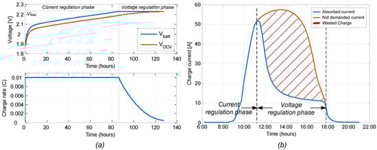 Continuous and shallow charge–discharge cycles drive the conventional ESSs into an intermediate state of charge, also known as PSoC. To depict this effect, a typical controlled charge process, Figure 3a, is compared with an off-grid PV charge process, is shown in Figure 3b. In Figure 3a, the hypothesis is that a 0.01 C charging current is permanently available. As it can be appreciated, the battery Open Circuit Voltage (Vocv) rises slower than the battery voltage (Vbatt). During the current regulation phase, also called bulk stage, the battery absorbs the maximum available power in the system. When the float voltage is reached, the battery charger changes to the voltage regulation phase, and the battery current decreases following a path determined by its impedance model, the open circuit voltage Vocv and the battery voltage Vbatt. The battery remains in this low-power state until it is fully charged. According to VRLA manufacturers, this technology takes 72 h (3 days) in the voltage regulation phase to get to the full-charge state [].