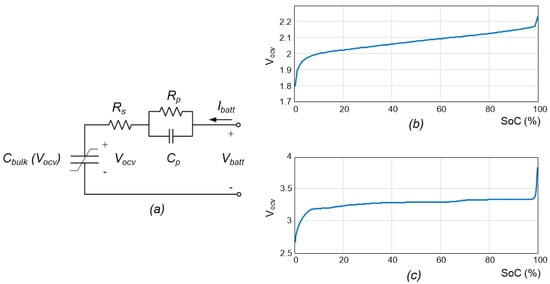 where Cbulk is defined as differential or small signal capacitance and depends on Vocv and thus is modeled by a voltage-controlled capacitor [,,,,]. It can be extracted from the SoC–Vocv curve of each chemistry (Figure 6b,c) as in (7). Here Q is the stored charge in the battery, and it is related to SoC through the rated capacity of the battery. Cbulk is not constant and varies depending on the existing Vocv.