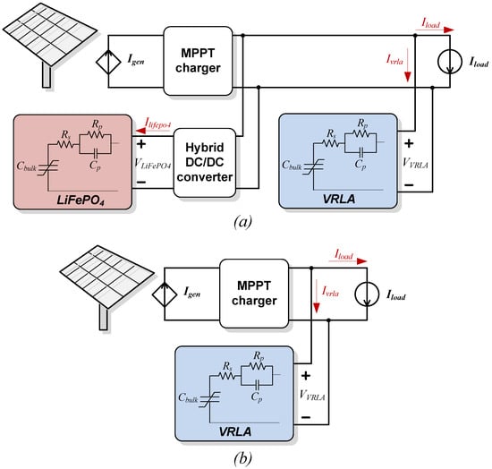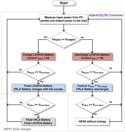 An Energy Management Strategy (EMS) is needed in order to obtain simulation results. For this purpose, a simple priority EMS was implemented in the simulator, see Figure 8 The selected EMS gives full priority to the charge and discharge processes in the LiFePO4 battery, relegating the VRLA battery to an emergency role. This technology assignation fits with the features of each chemistry type [], resulting in quick energy absorption and faster recovery during low irradiation days thanks to the LiFePO4 battery, and ensuring a completely full VRLA battery when it is needed. This strategy differs from the one presented in Ref. [], since their priority was charging the VRLA battery. However, that strategy does not benefit from the cycling capabilities of the Lithium-Ion element, and was evolved in refs. [,]. In this application, the EMS is implemented through the DC/DC hybrid converter, while the conventional Maximum Power Point Tracking (MPPT) charger only manages the float process in the conventional battery. Deeper research in EMS is a promising field of study but it is out of the scope of this paper.