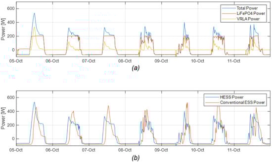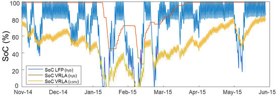 The increased absorption and the emergency role of the VRLA battery within the HESS makes its steady SoE higher. This is captured in the increase of the VRLA battery voltage; see Figure 17b. The HESS VRLA battery voltage shown in this figure presents a step during the night. This is the moment when the LiFePO4 battery (not plotted) has become fully discharged, and the VRLA battery starts powering the load, in its emergency role. If the voltages are compared at this moment of both VRLA batteries (when there is current flowing through them), a difference of 400 mV (33.3 mV/cell) can be noticed. According to manufacturer this means an energy increase of a 16% [].