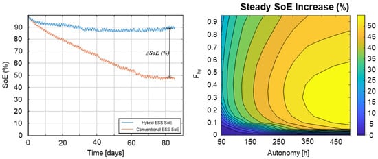 The simulation results are shown in the next figures. In Figure 10a, the steady SoE improvement for a sample case is depicted, while Figure 10b shows this metric for the whole design region. As displayed, for each autonomy value the optimal Fhy that ensures maximum energy absorption from the PV source is located around 20%–35%. Beyond this value, the SoE increase does not grow further (despite the fact that the HESS gains in chemistry quality and thus, becomes more expensive). This is a very interesting result, as it establishes that a Hybrid Lead-Acid + LiFePO4 system performs better than a single battery LiFePO4 system, which has a much higher cost. It can be explained as follows: in a single battery system, both chemistries, Lead-Acid and LiFePO4, suffer from PSoC though it has less impact in the LiFePO4 battery. In a HESS with a high priority EMS, only the high priority battery (LiFePO4) suffers PSoC. With low Fhy, this battery is small, so the incomplete charge overall losses are small, and the gains of having the Lead-Acid battery in a fully charge state are more evident. When Fhy grows, the high priority battery has higher capacity, and thus the overall impact of the incomplete charge effect is bigger. While there is still an important benefit over conventional ESS, the benefits of HESS become less evident. This will be further discussed in the conclusions section.