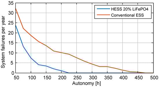 As an example, if Fhy = 20% is selected, the number of energy shortage events per year is depicted in Figure 11. For the specific irradiation conditions and the Pgen and Pcons values that are being simulated, there is a minimum autonomy value of 225 h which ensures a failure-less operation and allows SoE improvement. Increasing the autonomy further than this value does not improve the benefits of the HESS performance. Compared with the conventional ESS, the HESS guarantees a failure-less operation with half of the total autonomy size, which for the same consumption conditions means half of the battery capacity.