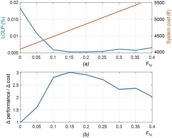 Defining the performance as the inverse of the LOLP, Figure 12 shows the relative increase in performance vs the relative increase in cost for every Fhy compared to the non-hybrid case. For this figure of merit, the optimum is found around 15%, a little lower that the case SoE increase. For this simulation, the prices considered were 0.2 €/Wh for the VRLA technology and 0.5 €/Wh for LiFePO4 technology. The price of the solar panels was considered constant in every case (2 €/W).