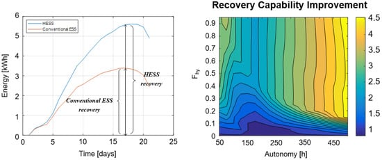 As the last figure of merit, Figure 13a shows the recovery capabilities of each system after a very low irradiation period, where the system suffered from energy disruption. After three weeks, the HESS was able to harvest more energy than the conventional system. Figure 13b shows the comparison between these two magnitudes, in the whole design region. The recovery capability has a dependence on the hybridization factor Fhy and the autonomy. It can be seen how a higher Fhy always means a higher recovery capability, regardless of the value of autonomy. In the selected design region (20% Fhy, around 225 h of autonomy), the HESS is able to recover between 1.2 to 1.5 times more energy after low irradiation periods, increasing the reliability of the whole system.