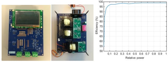 The HESS concept was tested in the supply system of a metering and communication installation located in an irrigation channel. The connection scheme is the one displayed in Figure 7a. The original supply system was formed by a single VRLA battery pack, four solar panels, and a solar charger. A state of the art bidirectional DC/DC converter, based on EPC-GaN power modules (Figure 14), was designed. The system was tested using LiFePO4 and VRLA batteries with the EMS of Figure 8 as explained in the simulation section. The DC/DC converter is highly efficient and is based on a buck- boost 3-branch interleaved topology [], but any other DC/DC converter with a reasonable efficiency will lead to almost the same results. The efficiency characteristic of the converter is also shown in the figure. In these first tests, the power through the converter to the LiFePO4 batteries was limited to 200 W.