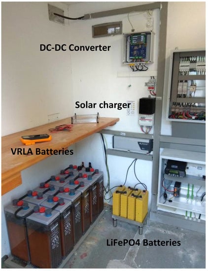 The traditional storage technology in ESS for industrial applications has been Valve Regulated Lead Acid (VRLA) batteries [,,]. However, Lithium-Ion technologies as LiFePO4 or devices as ultracapacitors are becoming an alternative in some specific fields, depending on whether the application is an energy-oriented application or a power-oriented application [,,]. For example, applications such as elevators [], need high power density so their ESS are mainly based on ultracapacitors. On the other side, applications as standalone photovoltaic systems for communication or metering stations (Figure 1), demand mid or long-term storage rather than high power peaks, so electrochemical technologies as battery packs (of the different chemistries already introduced) are best suited [,,,,,].