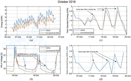 Stored energy (a), voltage of VRLA battery (HESS and ESS) (b), daily stored energy (HESS and ESS) (c), daily absorbed energy (HESS vs. ESS) (d).