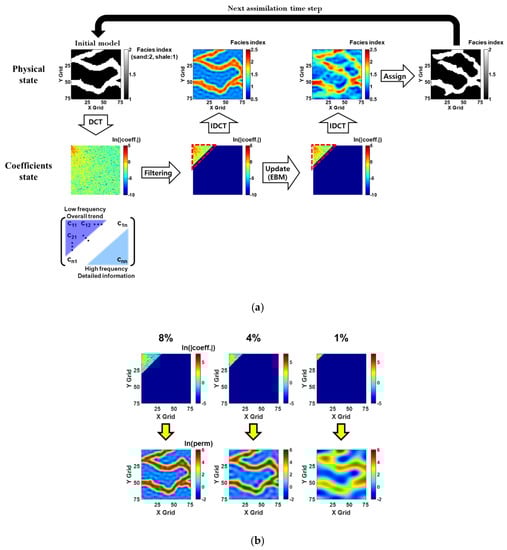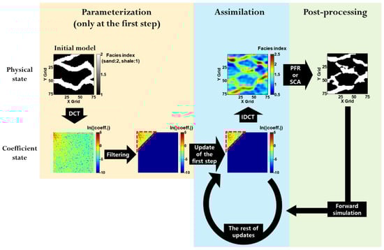 Figure 6 shows the overall workflow of the proposed method, the SCA, for ES-MDA using DCT with one realization example. The entire workflow consists of three parts: parameterization, assimilation, and post-processing. Initial ensemble members were transformed by DCT at the only first step in ES-MDA and DCT coefficients were filtered one realization by one realization (the second column in Figure 1a). The coefficients of each ensemble member were all updated together by the Kalman gain based on ES-MDA. Assimilated DCT coefficients were implemented through an inverse DCT for each realization (the third column in Figure 1a). In the post-processing part, the SCA was applied to the assimilated coefficients of all ensemble members. In this study, the PFR was also tested instead of the SCA for comparison.