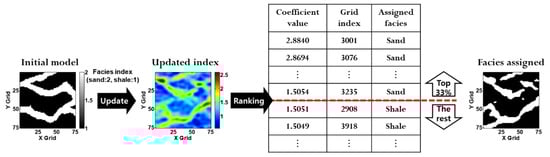 In spite of the advantages of DCT, it is difficult for updated parameters to be assigned to rock facies because they are continuous values, and do not have a bimodal distribution. Therefore, a post-process for an EBM with DCT is required to make clearly the boundary between the facies for updated continuous values. Kim et al. used the preservation of facies ratio (PFR) to assign facies to the continuous values according to the known facies proportions [,,]. Zhao et al. designated an index number to each facies and utilized regularization by using Vo and Durlofsky’s analytical equations to obtain facies indicators [].