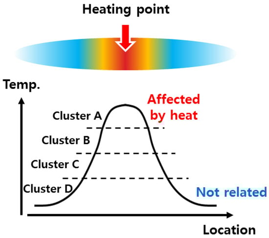 SCA has been applied to the discretization of a heat kernel or the image separation process [,,]. With the SCA, the relationship between data points is described using a Gaussian affinity matrix (Equation (11)). Eigenvectors of the matrix are computed, and only a portion of the eigenvectors is used such that we can present data points into a low-dimensional space. Consequently, the whole field can be divided into discrete clusters. The SCA has usually been utilized for discretization of an area affected by heat. Figure 3 shows a schematic concept of an SCA application for heat behavior. An area near a heating point will have a high temperature. The temperature will decrease steeply because of the heat characteristics. Thus, a Gaussian affinity equation is fitting to the discretization of a heated area and for describing the heat equation