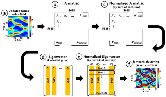 Figure 4 shows an example SCA application example on an average of one hundred updated facies index fields (Figure 4a). An affinity matrix was calculated using Equation (11), and is 5625 by 5625 in dimension because a reservoir grid system is 75 by 75 (Figure 4b). This reflects the relationship between each grid point. This matrix was normalized using the sum of each row (Figure 4c), and the eigenvectors were calculated (Figure 4d). One thing to note is that k, the clustering number, has to be decided in advance. The number of clusters was set to seven in this research based on an experimental sensitivity analysis. According to the experimental analysis, three or four clusters technically worked, but details of facies boundaries needed to be modified. In the case of five or six clusters, the boundary was decent overall. but we put one more cluster for a spare and seven clusters were finally chosen. Although a larger number of clusters than seven can give more details, it requires more computational cost and seven clusters are enough to describe information of facies distribution in this study. In Figure 4e, eigenvectors were normalized using the norm-2 of each row. Then, we regarded each row of the normalized eigenvector as each grid point, which can be assigned to each cluster through k-means clustering, as shown in Figure 4f. In this research, one hundred updated fields were converted into a clustered filed using SCA. Computational cost for application of SCA in the one hundred ensemble members took about nine minutes. The total cost was about 45 min because the number of data assimilations was equal to 5.