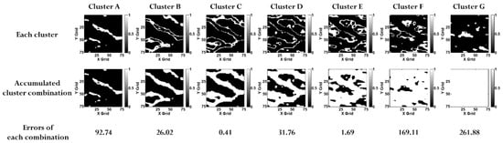 Figure 5 displays the facies distribution of cluster combinations based on the sequence arrangement and averages of the dynamic data errors. The white indicates sand, and the black is shale. The first row shows each cluster, and the second row indicates the accumulation of each class in sequence such as A, A + B, and A + B + C. For example, the last model in the second row only consists of sand facies due to summation of all clusters. In the last row, a dynamic data error was estimated using Equation (12) to verify which cluster combination is the best to describe a channel pattern.