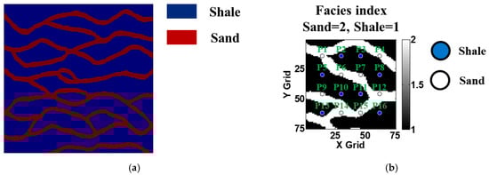 One state vector indicates one reservoir model in an EBM. The state vector consists of DCT coefficients of facies indexes of a reservoir, as shown in Equation (2) in this study. The facies index numbers assigned to sand and shale are 2 and 1, respectively. Petrophysical values such as the permeability, porosity, and relative permeability are determined according to the facies.