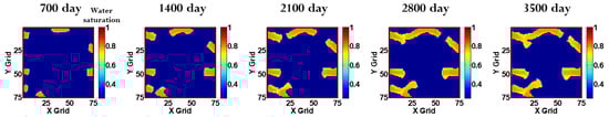 In this research, our target was 2D channelized gas reservoirs with an aquifer. The grid size of the reservoir model is 250, 250, and 100 ft for x-, y-, and z-axes, respectively. Reservoir models of the ensemble and the reference field were generated using a single normal equation simulation (SNESim) of the SGeMS. The number of ensemble members was 100. Figure 7a,b shows the training image (TI) used in SNESim and the reference field. The facies proportions of the TI were 28% and 72% for sand and shale, respectively. Figure 8 presents water saturation maps in each time step of observation to understand reservoir behaviors in the reference model. As time goes by, water comes into the reservoir from four sides of the aquifer. It is clear that water behavior absolutely follows the channel. That means figuring out the channel pattern is important for history matching. The sand proportion of the reference is 33%, which was applied to the PFR case. That means the PFR is likely to give a good history matching result, so we can verify the SCA performance strictly through comparison with the PFR.