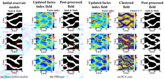 Before an analysis of the final updated results, we checked how the PFR and SCA work in an updated facies index field. Figure 9 shows three examples of the initial reservoir models, updated facies index, and post-processed results using the PFR and SCA. In the initial models of Figure 9a, facies index fields have values of 2 and 1 for sand and shale, respectively. After updates by ES-MDA such as for the first columns of Figure 9b,c, the models had smeared out channel frontiers and it was hard to tell which area had to be sand or shale. That is the reason why we needed the post-processing techniques of PFR or SCA.