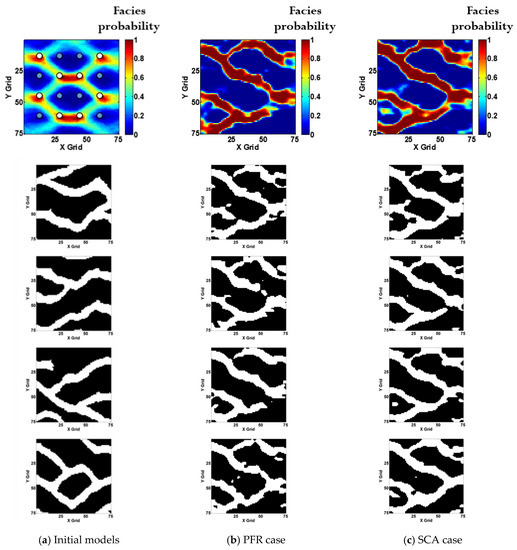 Figure 10 shows the initial and final updated facies distribution. In the first row, the sand facies probability maps are presented. They are averages of one hundred realizations. Each value of grid is 0–1, which shows what probability a specific grid has to appear. Figure 10a–c is the initial models and the updated models by PFR and SCA in sequence, respectively. Four reservoir models below the first row are examples among one hundred models of the averages.