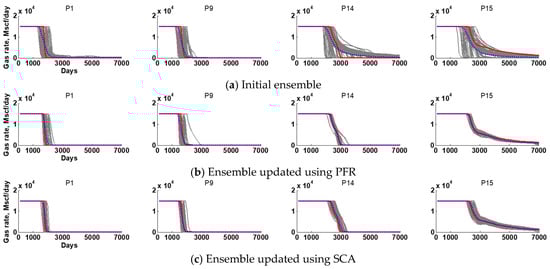 Gas production rates of the initial ensemble show a large discrepancy between the blue and red lines, particularly for P14 and P15. The PFR and SCA give well-predicted results in both of the wells. In the PFR case, a couple of grey lines are deviated from the others for wells P9 and P14 (Figure 11b). This seems to be due to a determination of the facies from the cut-off without a consideration of the channel pattern compared to the SCA.