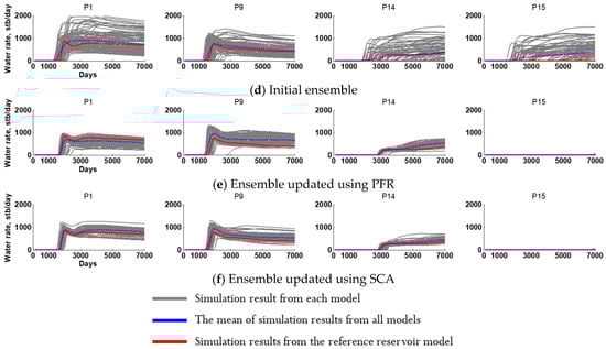 Figure 11 describes the prediction of well gas and water behaviors from 0 to 7000 days of the initial and updated ensemble by the PFR and SCA. Four representative wells with large uncertainty are compared among the sixteen production wells. One of goals of history matching is to properly decrease high uncertainty, which is challenging and necessary at the same time. That is the reason why we need to check uncertainty of reservoir models before and after assimilations. In addition, the sensitivity between reservoir parameters and observations needs to be checked for a successful history matching to calibrate appropriate parameters []. The gray lines are the behaviors of one hundred realizations and the blue dotted lines are their means. The red lines are the behaviors of the reference field. The gas production rate is set to be maintain a plateau of 15,000 Mscf/day. In general, gas rates show a plateau until about 2000 days and then they start to go down. The decrease of gas rate is because of mainly two reasons: water breakthrough and pressure decrease. Gas rates of well P1, P9, and P14 decrease with an increase of water rates in the reference model: water breakthrough. On the other hand, gas production rate at well P15 shows a downtrend at around 2500 days without water production. The production rate decreases gradually to maintain the bottomhole pressure at a certain value because bottomhole pressure reaches the constraint of the production well.