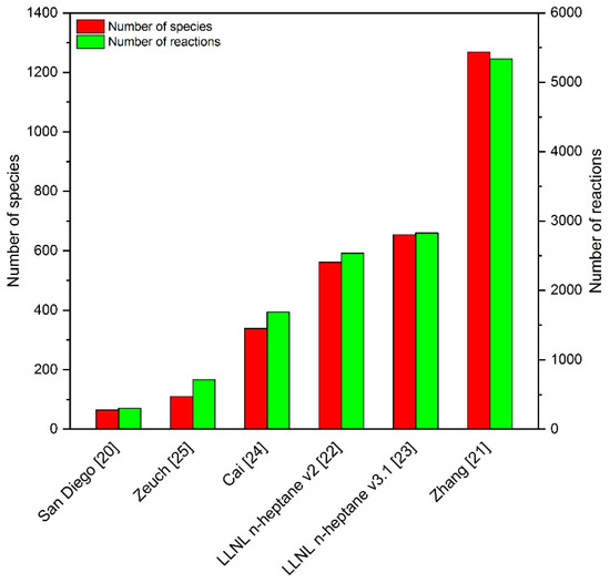 Diesel fuel is a complex mixture of thousands of hydrocarbon compounds with carbon numbers between 6 and 28 [9]. Detailed kinetic models containing all relevant species are often not available. Furthermore, the consideration of a large number of species would lead to an enormous computational effort. Therefore, it is convenient to define a substitute fuel that can represent the overall combustion behavior of diesel fuel. For dual fuel investigations, n-heptane is a common diesel substitute [10,11,12,13,14] and was used as a surrogate in this investigation. With a cetane number (describing the ignitability of the fuel) of 56 [15], n-heptane is well suited as surrogate fuel, since, according to the DIN EN590 standard from October 2009, diesel has to show a minimum cetane number of 51 [16]. As with diesel fuel, it is also necessary for natural gas to define a substitute fuel. A commonly used substitute is methane [17,18,19]. However, in order to better map the methane number (measure of knock resistance) of natural gas, a mixture of methane and propane as substitute fuel was defined in the present study. Since n-heptane was used as a diesel substitute, various n-heptane mechanisms have been investigated concerning their suitability for calculating the ignition properties of fuel blends used in dual fuel studies. The selection process was carried out by comparing measured and simulated IDTs of various homogeneous methane–propane–n-heptane mixtures in the pressure range 60 to 100 bar, temperature range 701 to 1284 K and an air–fuel equivalence ratio between 1.226 and 1.9. The IDTs were determined with the help of the RCM and ST at PCFC (Physico Chemical Fundamentals of Combustion), RWTH Aachen University. A detailed description of the experimental procedure and the measured values is available in [6,7]. The mechanism search ranged from the very compact Complete San Diego mechanism (version 2016-12-14) with n-heptane extension (version 2015-03-01) [20], which takes into account a total of 301 reactions, to the very large mechanism of Zhang et al. [21] with more than 5000 reactions. Before the San Diego mechanism could be used, the Complete San Diego mechanism and the n-heptane sub-mechanism had to be merged together. This overall mechanism was then read in with LOGEresearch and a new mechanism, transport and thermal file was exported. This process ensured that, on the one hand, there was no double definition of species, and on the other hand, that the transport and thermodynamic files were shortened to those species that were actually used by the mechanism. Further investigated mechanisms on the shortlist were the n-heptane mechanisms version 2 and 3.1 of the Lawrence Livermore National Laboratory (LLNL) [22,23], the n-heptane mechanism of Cai et al. [24] and the n-heptane skeleton mechanism of Zeuch et al. [25]. Figure 1 shows an overview of the number of considered species, as well as the number of reactions of the respective mechanisms.