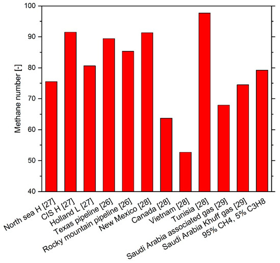 In the case of methane–propane–n-heptane mixtures, a mixture of 95 mol % methane and 5 mol % propane served as the surrogate base mixture to which n-heptane was added. The comparison with the methane numbers (MNs) of natural gas from different extraction areas [26,27,28,29] in Figure 2 shows that the MN of the natural gas surrogate base mixture lies in the middle between very knock-resistant and easy-knocking natural gases. The MNs were determined with the Cummins Westport Fuel Quality Calculator [30].