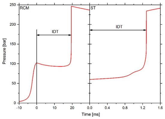 Simulated pressure history and ignition delay time (IDT) definition for rapid compression machine (RCM, left) and shock tube (ST, right) simulations.