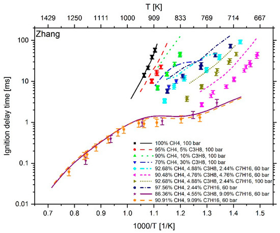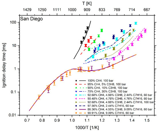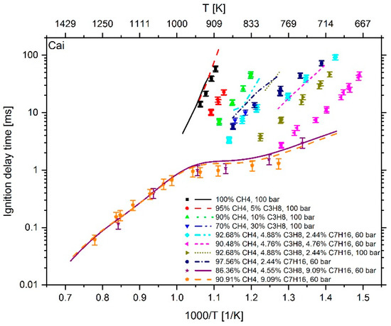 In the following, Figure 4, Figure 5, Figure 6, Figure 7, Figure 8 and Figure 9 show the comparison between the experimentally determined IDTs represented with symbols and the calculated IDTs shown with lines. Since facility effects were taken into account in the simulations of the RCM data using a non-reactive pressure profile, the simulation time was limited to the pressure time history. In the case that the calculated IDT is above the time length of the non-reactive pressure profile, a value cannot be specified.