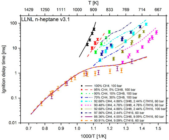 Increase of the IDT by adding methane to the n-heptane–air mixture simulated at ϕ = 1 and 60 bar.
