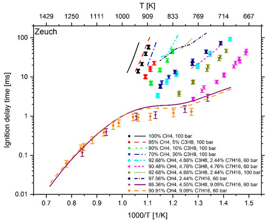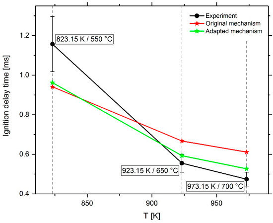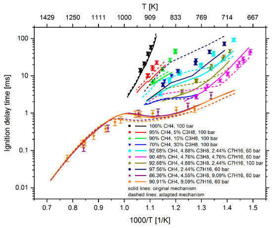 In order to allow a comparison of the reaction rate coefficients before and after the adaptation with an as large as possible number of reference data from literature, data from the NIST (National Institute of Standards and Technology) database [36] were included in the optimization process. In the case of reaction 42, a total of 88 data sets [37,38,39,40,41,42,43,44,45,46,47,48,49,50,51,52,53,54,55,56,57,58,59,60,61,62,63,64,65,66,67,68,69,70,71,72,73,74,75,76,77,78,79,80,81,82,83,84,85,86,87,88,89,90,91,92,93,94,95,96,97,98,99,100,101,102,103,104,105,106,107,108,109] over the temperature range 178 to 3000 K were used for comparison. For reaction 44 and 45, six [42,45,108,110,111,112] and three [42,45,113] data sets in the temperature range 300 to 2500 K were available. For the reaction 42, 44 and 45, the adaption was performed by changing the activation energy of the respective elementary reactions. The largest adjustment was made in reaction 42, which shows, as exhibited in Figure 19, the highest sensitivity in the temperature range considered compared to reaction 44 and 45 and thus a correspondingly large impact on the overall reactivity. Furthermore, in the publication of Fu et al. [114] it is shown that reaction 42 contributes significantly to the increase in IDT when methane is added to an n-heptane–air mixture through the depletion of OH radicals. Therefore, to curb the consumption of OH radicals by reaction 42, the activation energy was increased leading to a reduction of the reaction speed. As can be seen in Figure 19, the reactions 42, 44 and 45 show different courses of the temperature-dependent sensitivity. Based on this, the reactions 44 and 45 were utilized to fine-tune the mechanism adaptation by analyzing which reaction in which temperature range could be used for increasing or decreasing the IDT so that through the interaction of the adjustment of all three reactions a maximum reduction of the deviation between the simulations and experiments in the respective temperature range could be achieved.