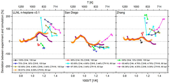 Percentage deviation between measurement data and simulation results using the mechanism LLNL n-heptane v3.1 [23] (left), Complete San Diego mechanism with n-heptane extension [20] (middle) and the mechanisms of Zhang et al. [21] (right).