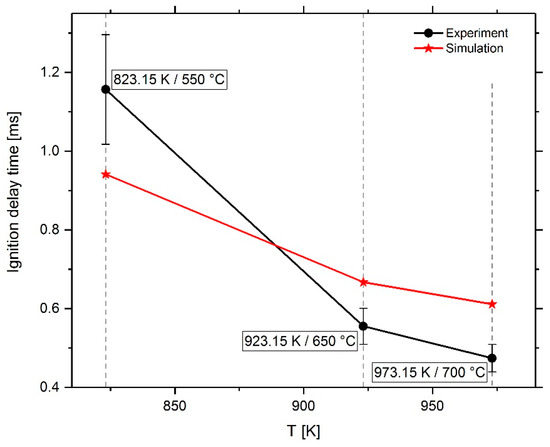 Assessing the results of the RCEM simulations in Figure 12, the experimentally determined ignition time is reproduced well for injecting diesel into the compressed air. At the time point of starting the diesel injection the gas temperature is 847 K, as shown in the diagram in the top left corner of Figure 12. Due to the progressive compression of the gas, the temperature continues to rise to 863 K. From this point on, a further increase in temperature can be seen, which is above the value achievable by the compression of the gas. This is an indication of the onset of the diesel reaction. After this steeper temperature rise and the achievement of 873 K, it comes to ignition, which is characterized by a strong increase of the temperature. The considered temperature values in the RCEM simulation are close to those values in the spray box simulation at which the difference between the measured and calculated IDT is small, which is an indication that that the RCEM and spray box simulations are in line with each other.