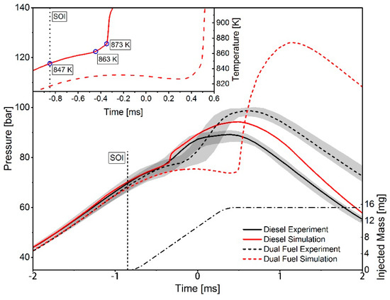 Pressure traces from the computational fluid dynamics (CFD) simulation and measured values from a rapid compression expansion machine (RCEM) for diesel and dual fuel combustion with 20% energetic diesel share. The diagram in the top left corner shows the corresponding simulated temperature traces.