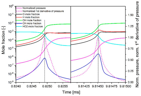 Simulated chronological mole fraction sequence of the species O, H, OH, CH and HO2 as well as the pressure curve in the range of ignition of an n-heptane–air mixture at ϕ = 1, T = 750 K and p = 60 bar (left) and a methane–air mixture at ϕ = 1, T = 950 K and p = 60 bar (right) using a CV reactor.