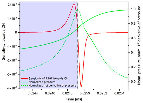 As an example, Figure 14 shows the simulated time-dependent sensitivity profile of reaction 297 (n-C7H15 + O2 ↔ n-C7-QOOH) towards the species CH for an n-heptane–air mixture at ϕ = 1, T = 750 K and p = 60 bar. In addition, the pressure curve can be seen, where, by definition, the ignition point is located at the point of fastest pressure increase. Shortly before the ignition (i.e., in the period in which CH is significantly formed), the sensitivity increases sharply and falls afterwards into the negative range momentary. Since only the sensitivity values up to the point of ignition are of interest for the determination of the maximal positive or negative sensitivity value, only results in the period up to ignition were considered. In the diagram, this area is highlighted blue. It has to be mentioned that all sensitivity values shown in this study take into account both the forward and the reverse direction of the reactions.