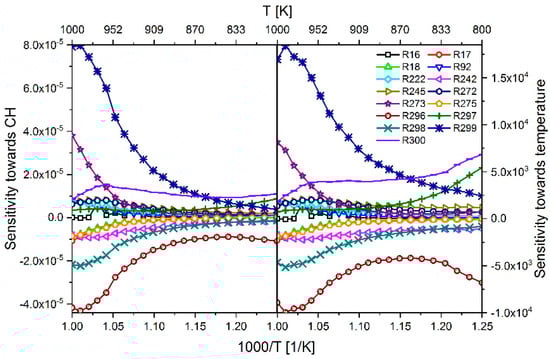 Another way to determine the influence of the reactions on the IDT is to perform a sensitivity analysis towards the temperature. Ji et al. [35] showed that there is a direct correlation between temperature sensitivity and IDT sensitivity. As an example, Figure 15 shows a comparison of the sensitivity towards the species CH and the temperature, simulated with an n-heptane-air mixture at 60 bar and ϕ = 1. It can be seen that the temperature-dependent sensitivity curves of both analyzes show a qualitatively similar course and thus both methods are suited for further mechanism analyzes. However, to avoid confusion, all further sensitivity analyzes shown in this study have been performed consistently towards the species CH.