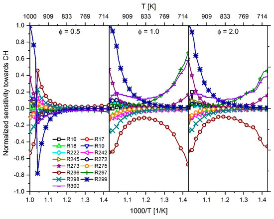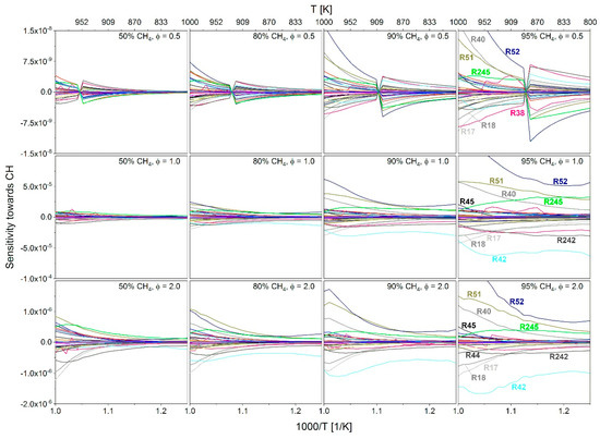 As previously stated, the diesel spray ignition calculated via CFD simulation results on the one hand in a small IDT at 823 K, and on the other hand at 923 K and higher, and the IDT is overrated as shown in Figure 11. To determine the most influential reactions, a sensitivity analysis towards CH was performed with an n-heptane–air mixture in the temperature range 700 to 1000 K at a pressure of 60 bar and a fuel–air equivalence ratio of 0.5, 1.0 and 2.0 to assess the influence of a fuel-lean, stoichiometric and fuel-rich mixture on sensitivity. The course of the sensitivities is shown in Figure 16.