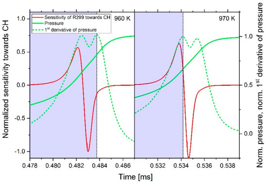 At a fuel–air equivalence ratio of 0.5, a sign change of the sensitivity values can be determined between 960 and 970 K. This can be explained by the fact that the pressure curve in the area of the ignition shows two steep rises. As shown in Figure 17, up to 960 K, the second rise has the highest slope, which defines the point of ignition at this position. From 970 K, the slopes of the two rises change so that now the first rise shows the largest slope. By shifting the position of the largest pressure increase, the point of ignition also changes by definition. As a result, when searching for the maximum positive or negative sensitivity value, value ranges of different sizes are scanned; thus, the maximum value can vary and even change the sign. In Figure 17, the scan range is highlighted in blue. However, with the results of the sensitivity analysis, reactions with high positive or negative sensitivity values in the considered temperature range were determined and are listed in Table 2.