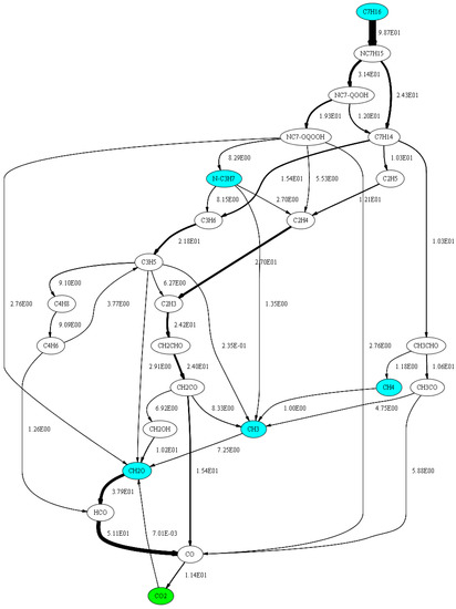 Adapted from the comparison of the combustion vessel measurements with the CFD spray box results shown in Figure 11, it can be supposed, based on the data available and the assumption of a linear progression of the curve between the measuring points, that the mechanism calculates the IDT correctly at a gas temperature of around 880 K. At 823 K the IDT is underestimated, at 923 K and higher an overestimation is apparent. In order to determine which reactions can be used to improve the mechanism, the oxidation pathway of n-heptane was considered in more detail.