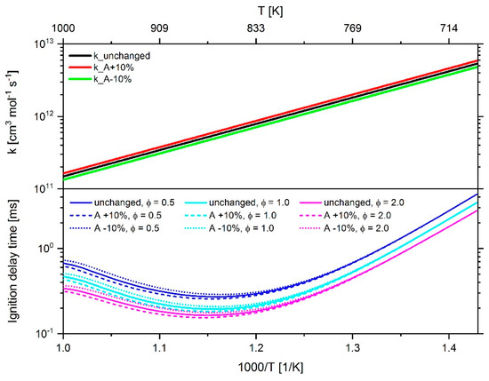 Effect of adjusting the frequency factor of reaction 299 by ±10% on the reaction rate constant k and the IDT simulated with an n-heptane–air mixture at 60 bar and a fuel–air equivalence ratio of 0.5, 1.0 and 2.0.