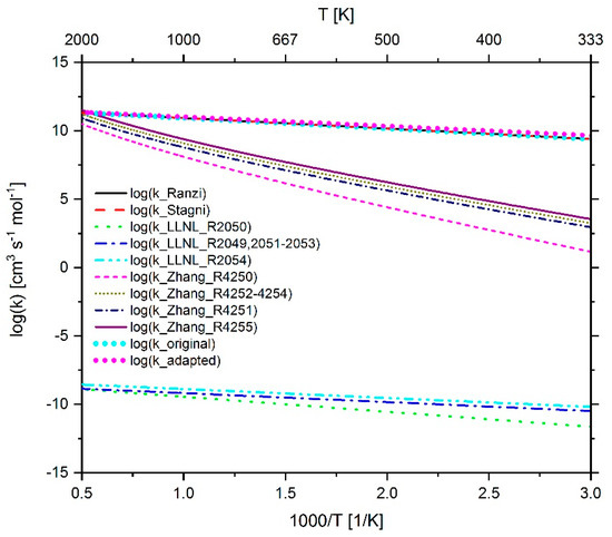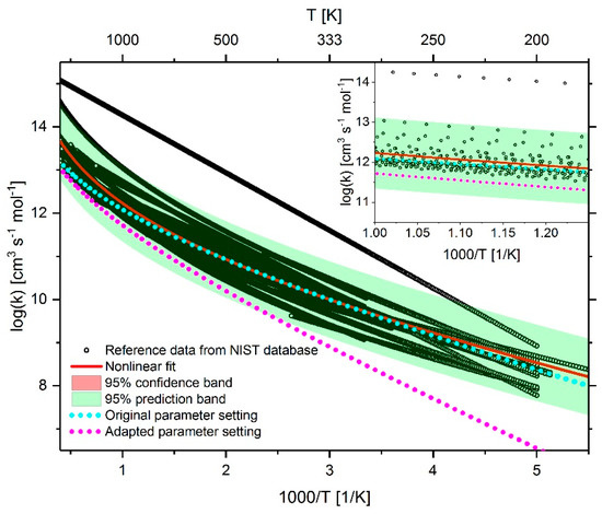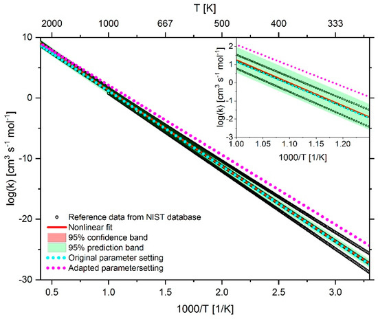 (with the frequency factor , the temperature exponent , the activation energy , the temperature and the universal gas constant ) and the values given in the NIST database for the Arrhenius parameters, the reaction rate coefficients for each data set in the specified temperature interval were calculated with a temperature resolution of 1 K. All these calculated data points were used to compute a fit function. The fit was performed with the software Origin (OriginPro 2017, OriginLab Corporation, Northampton, MA, USA) [115], where the extended Arrhenius approach served as basis for the nonlinear fitting procedure. The green shaded area in the diagrams represents the 95% prediction band of the fit function. The small diagram in the upper right corner shows a closer look to the progression of the reaction rate coefficient in the temperature range of 800 to 1000 K. At this point it is important to mention that the authors are aware that for example in the case of the well-studied reaction 42, the change in the activation energy is large. It should be noted, however, that it was not the target to develop a mechanism that could be generally used for a variety of problems, but to develop a mechanism specifically optimized to get the best possible agreement between the experiment and simulation results for the given parameter range in this study.