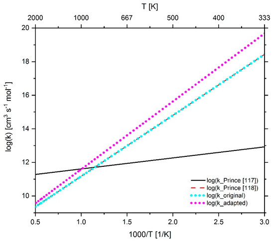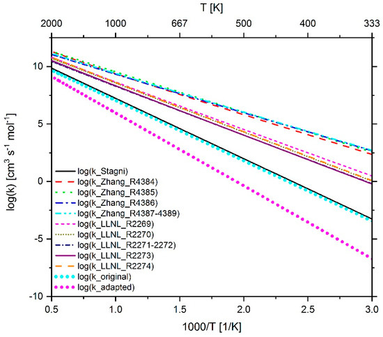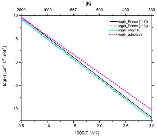 - Cohen, N.; Westberg, K.R. Chemical Kinetic Data Sheets for High-Temperature Chemical Reactions. J. Phys. Chem. Ref. Data 1983, 12, 531–590. [Google Scholar] [CrossRef]