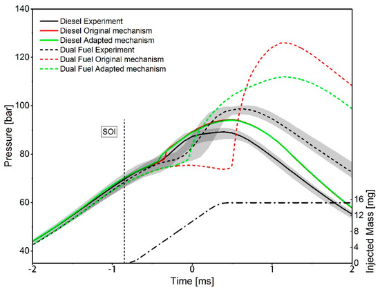 The ignition of diesel in a gas–air atmosphere was investigated using a RCEM. The test rig is equipped with a pneumatically driven connecting rod, which follows the kinematics of a real engine crank drive around the top dead center. During the test procedure, the combustion chamber is charged with a natural gas–air mixture, which is compressed by the piston during the compression stroke. Close to the top dead center the pilot fuel is injected and ignites the mixture. The cylinder pressure is thereby recorded by a pressure transducer mounted in the cylinder head. For the CFD simulations, a moving mesh is generated that depicts the geometry of the RCEM combustion chamber. The refinements in the spray area are transferred from the spray box investigations, to ensure a comparable mixture preparation. For further information on the experimental setup and the computational method refer to Reference [8]. The simulations of the dual fuel combustion were carried out with an energetic diesel share of 5%, 20% and 40%, whereby, for illustration, in the following consideration results with 20% share are discussed in detail. Figure 12 illustrates the measured and simulated pressure traces for diesel and dual fuel combustion. The injected amount of diesel and the injection timing is kept constant. While the ignition delay for pure diesel, defined as duration from start of injection to the first pressure rise, can be predicted quite well by the Complete San Diego mechanism with n-heptane-extension, a larger deviation can be seen for the dual fuel case. The IDT-increasing effect of the natural gas addition is overestimated compared to the experimental results.