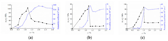 Relation between servo-controlled and stress permeability under saturated condition [29]; (a) Limestone; (b) Fine sandstone; (c) Medium sandstone.