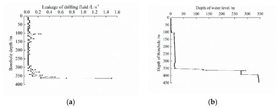 Leakage of drilling fluid and the water level depth measured on site. (a) Relationship between leakage of fluid and drilling depth. (b) Relationship between water depth and borehole depth.