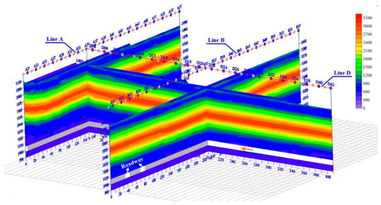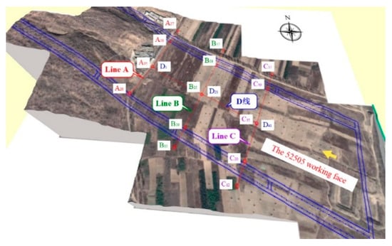 Due to the MT method being susceptible to an undulating terrain, it is characterized by the fact that the closer to the steep straight edge, the more susceptible it is to the terrain, the larger the difference between the mountain or the valley, the more susceptible it is to the terrain, and the mountain is more affected by the terrain than the valley. Considering the topographic factors of the ground surface, the relatively flat area above the setup room of the working face is selected for the MT method detection. Four detection lines were set on the ground surface (as shown in Figure 5), where the A, B, and C lines are parallel to the width of the working surface, and the distance between the adjacent two lines is 200 m. The D line is parallel to the length of the working face and is located at the center of the working face. The probe distance is 10 m. Combining with the survey lines and mining situation, the aquifer failure characteristics of line A are mainly analyzed, and line B is used as the verification of line A. According to the detection results before mining, the AR contour of overburden is shown in Figure 6.