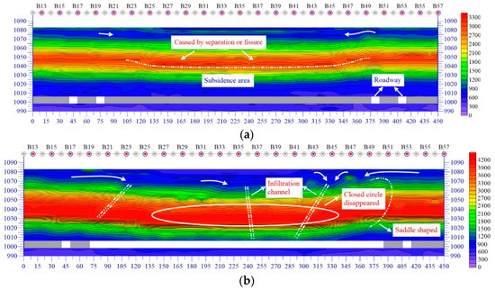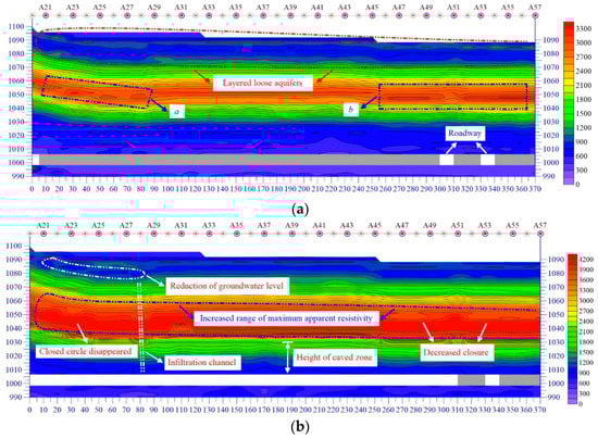 In order to verify the credibility of line A’s detection results, the AR characteristics of line B during and after mining were selected for comparison. It should be noted that the second measurement after mining is delayed for several days because of the rainy days, so the line B is detected immediately after the weather clears up. Therefore, the occurrence state of overburden and aquifers detected by line B in the second measurement is not entirely affected by mining, but its structural change is reflected by high-intensity mining. The overburden AR contours during and after mining are shown in Figure 8.