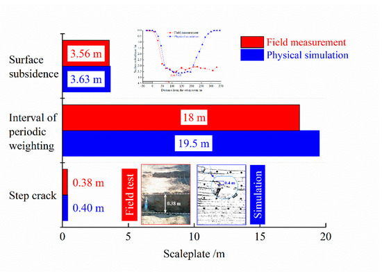 Considering the geological conditions and the test-bed size (length × width × height = 4 m × 0.3 m × 2.2 m), the similarity coefficient of model is determined based on the principles of moderate size, easy to construct, similar and effective, easy to observe, and objective and reliable: Geometric similarity is 1/70, time similarity is 1/8.366, bulk density is similar to 0.6, and the strength and elastic modulus are both 0.00857. A 50 m coal pillar is reserved on both sides of the model. Combined with the field advance speed and similarity coefficient, the model is advanced 0.1 m each time from right to left. During the mining process, the coding and non-coding points on the model surface are observed by a three-dimensional optical photogrammetry system (XJTUDP). The sketch of the overburden failure pattern when advanced 300 m is shown in Figure 9, and the comparison between simulation and field measurement from surface subsidence, interval of periodic weighting and step crack is shown in Figure 10.