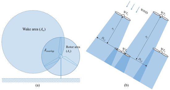 The rotor of the wind turbine affected by the wake is fully or partially affected by single or multiple wakes depending on the wind direction, as shown in Figure 2. In the case of a wind turbine that is partially affected (Figure 2a), the wind speed deficit can be calculated as the ratio of the intersecting area between the wake and rotor to the rotor area: