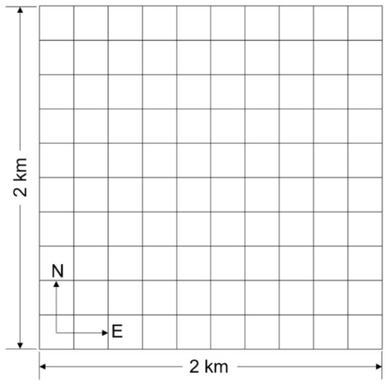 In the present study, the wind farm model used to perform the wind farm layout optimization is a hypothetical wind farm which was used by Mosetti. The wind farm has a square grid as the computational domain divided into 100 square cells, where a wind turbine is placed at the center. Figure 3 shows a grid of the wind farm, where each cell is equal to five rotor diameters (5D, 200 m × 200 m), the square grid has 10 columns and 10 rows of cells, and the total wind farm size is 2 km × 2 km. In the wind farm, wind turbines with a rotor diameter of 40 m are placed at the center of the cell, maintaining a 5D separation distance between the wind turbines. The specifications of the wind turbines and the wind farm that are applied to the layout optimization, which are the same as those in the previous studies, are presented in Table 1.